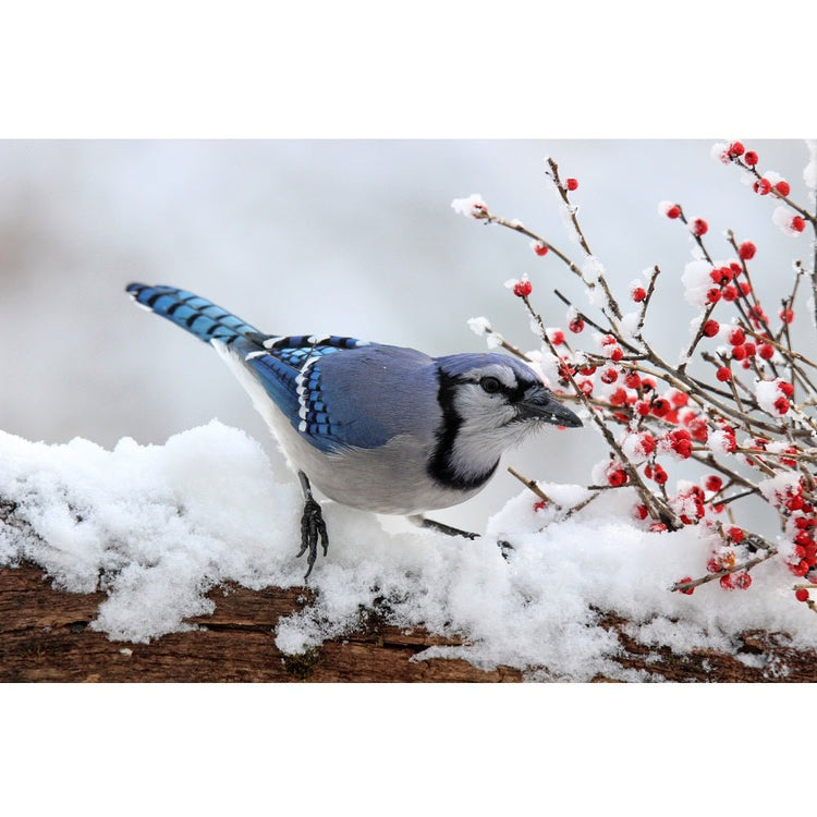 Realistic Blue Jay with Winter Berries Fabric Panel Details