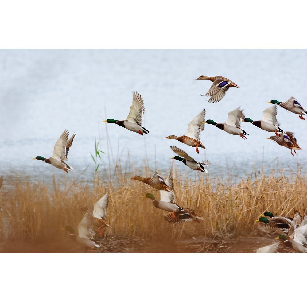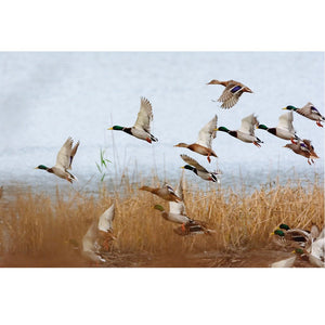 Realistic Mallards Flying Over Lake Fabric Panel Details