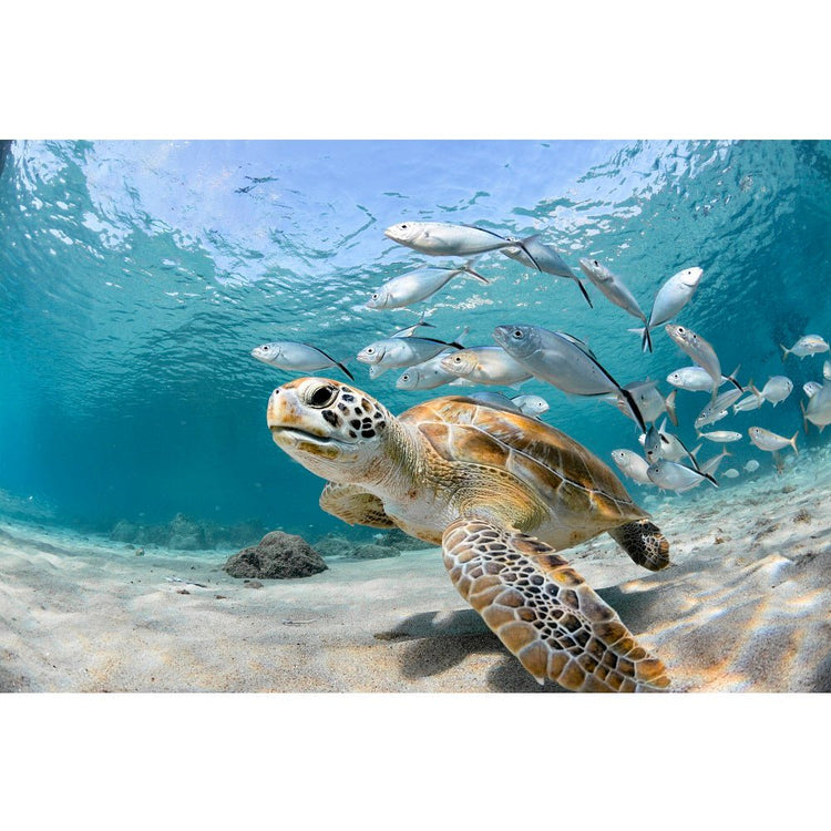 Realistic Sea Turtle with School of Fish Fabric Panel