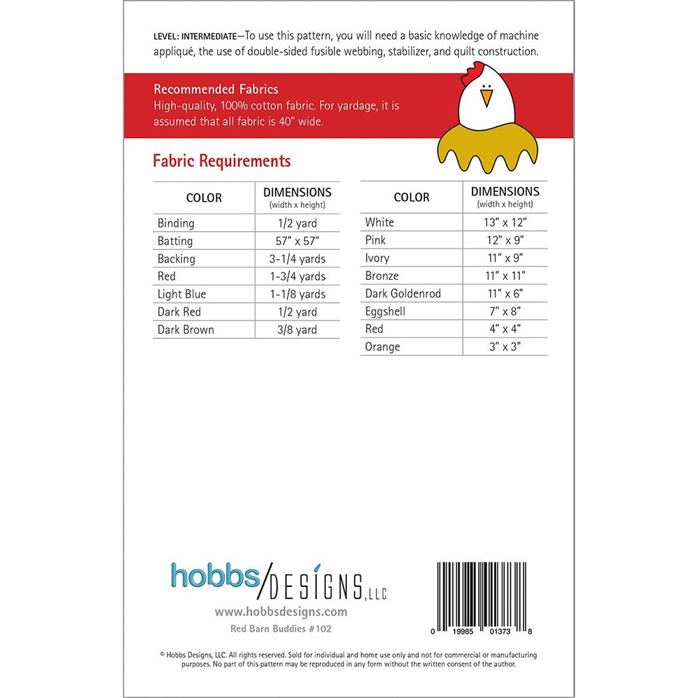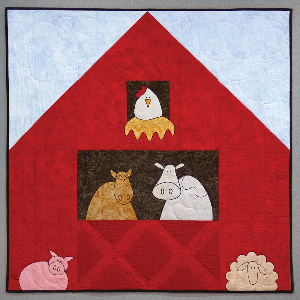 The Red Barn Buddies Baby Quilt is great for those with a basic knowledge of machine applique, the use of double-sided fusible webbing, stabilizer, and quilt construction. This large block design finishes to 48" square and is customizable; you could add a child's name, initials, or birthdate. Gift this blanket at a baby shower, birthday, or holiday get-together. Included with the Red Barn Buddies Baby Quilt, you get step-by-step instructions and a list of suggested materials.