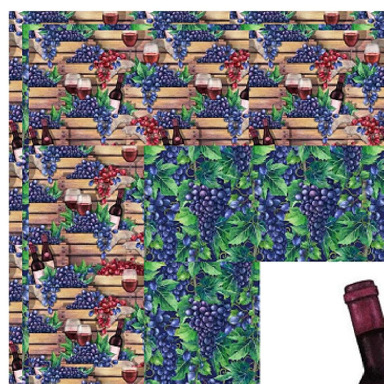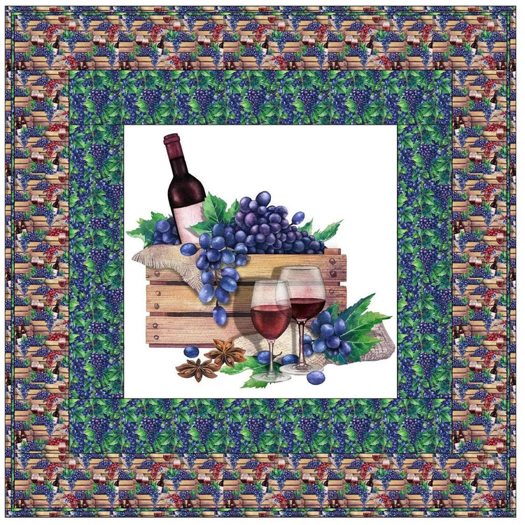The Red Wine Crate Wall Hanging includes everything that you need to make the quilt - the instructions and a total of 3 1/2 yards of fabric and a 23" panel. It has two borders and is finished with a flange binding. Batting is sold separately. The finished size of this quilt is 42" x 42".