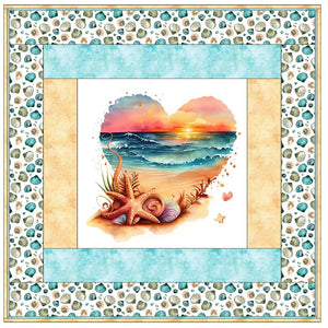 The Retro Beach Heart 3 Wall Hanging includes everything that you need to make the quilt - the instructions and a total of 4 yards of fabric and a 23" panel. It has two borders and is finished with a flange binding. Batting is sold separately. The finished size of this quilt is 42" x 42".