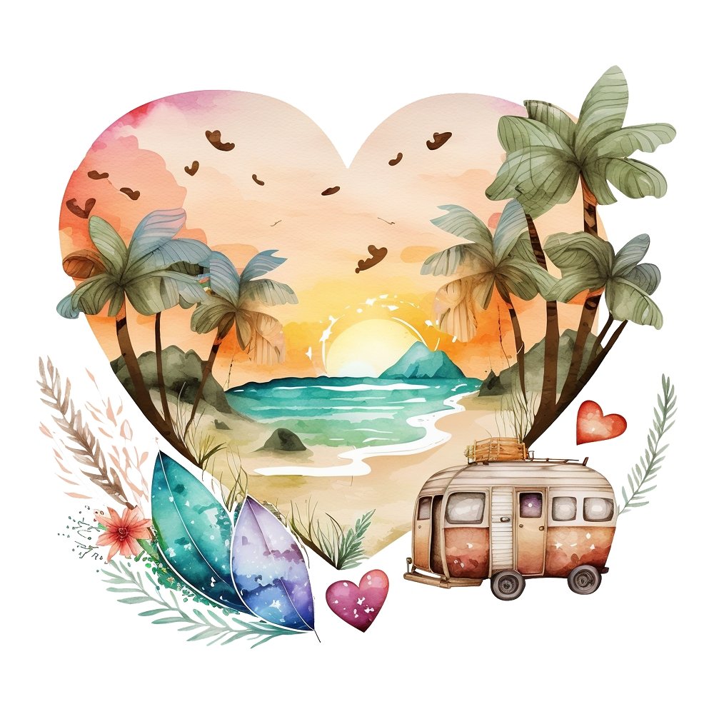 The Retro Camping Beach Heart 1 Fabric Panel is part of the Beach Hearts Fabric Collection printed by Sewing Parts Online. Digitally Printed on 100% cotton. This panel is available in 6 different sizes: