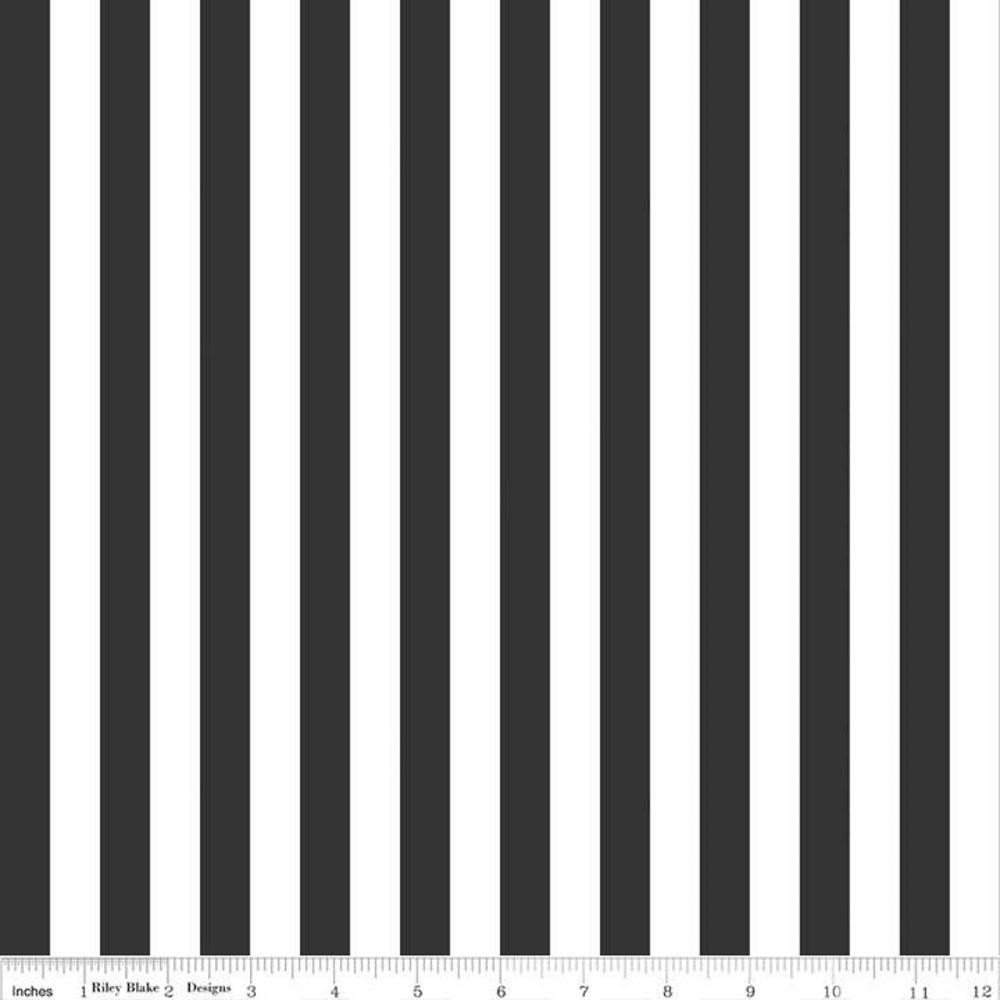 This Striped Fabric is a part of the Riley Blake Designs Basic Fabric Collection. This fabric features 1/2" vertical black colored stripes all over with white. The Riley Blake, 1/2" Striped Fabric is made with 100% cotton and measures 44" wide.