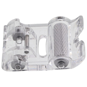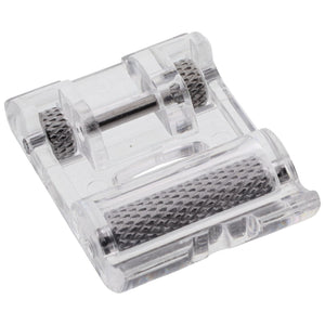 The Roller Foot makes sewing or piecing leather or suede much easier. Its textured roller ensures excellent grip on the sewn materials and allows less friction between the foot and the feed dogs. A roller foot is also a great alternative to Ultra Glide feet.