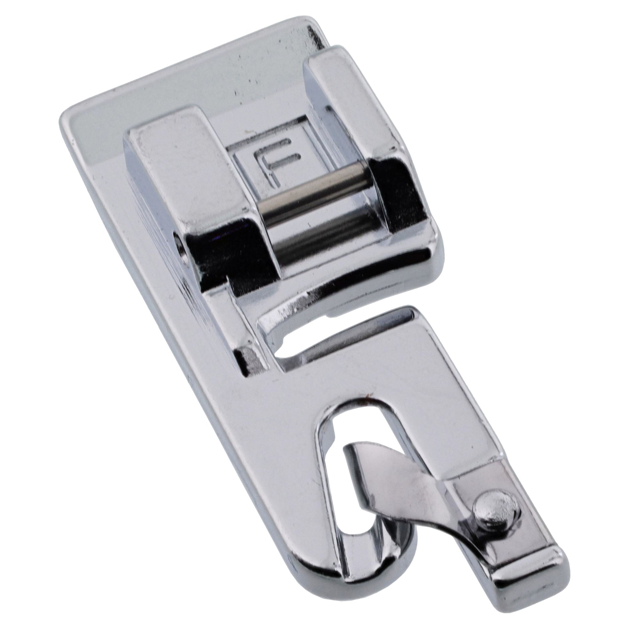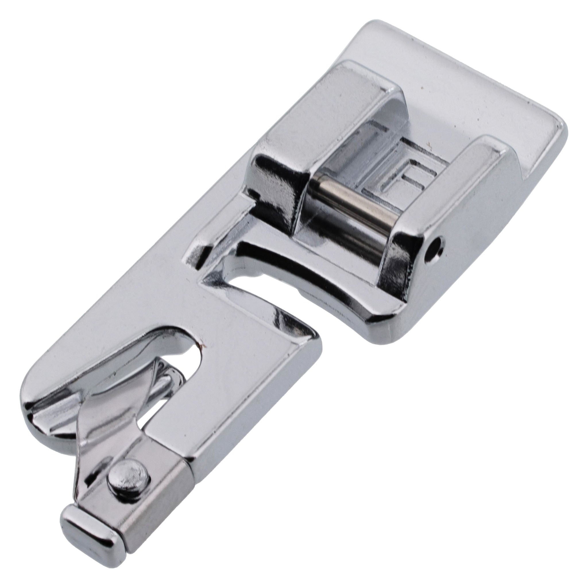 Feed your fabric through the small funnel located on the front of the foot. The funnel turns the fabric under while the needle stitches it down to create a perfect narrow hem.