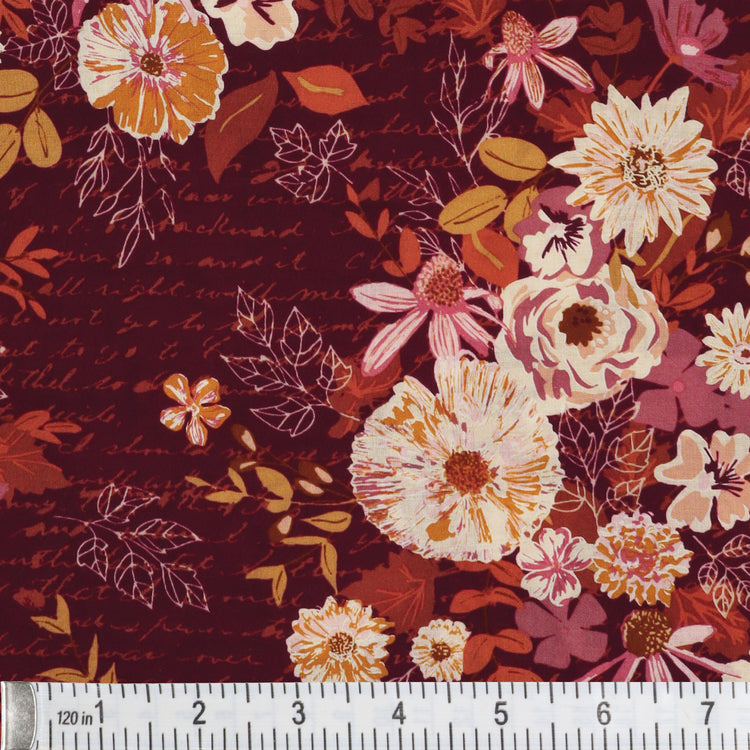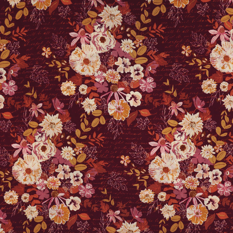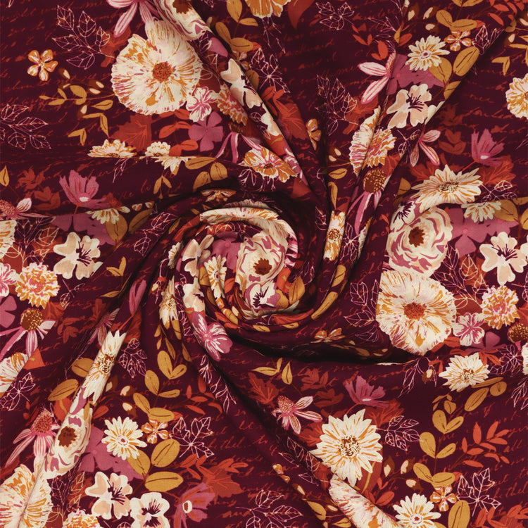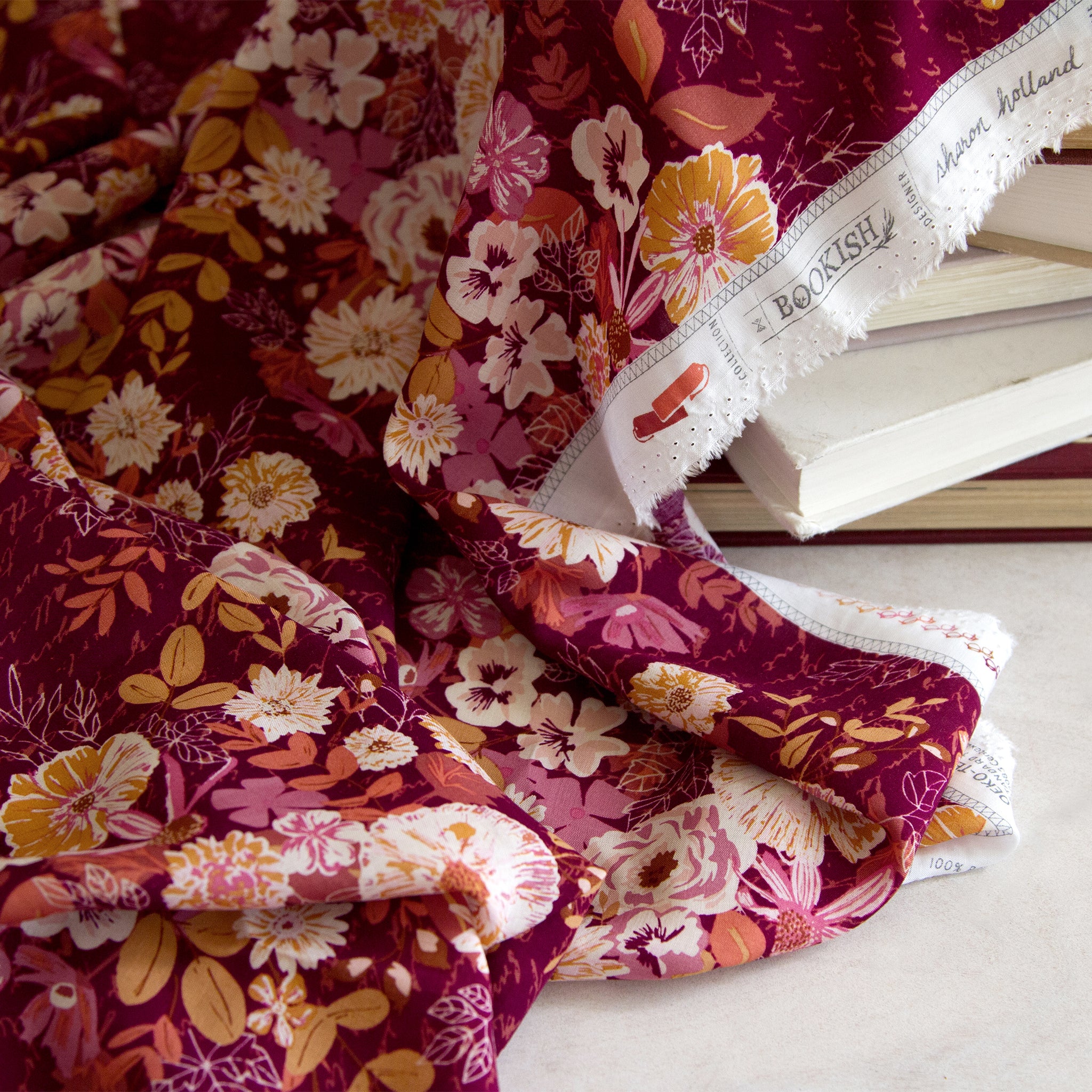 Fall into the cozy charm of Romance Novel Picaresque, a lush rayon fabric designed by Sharon Holland for the Bookish collection. Bursting with vintage-inspired florals in a palette of rose, marigold, cream, and dusty burgundy, this design evokes quiet afternoons with a classic novel and a warm cup of tea. Perfectly capturing the romance and whimsy of well-worn book covers and library shelves, this print invites you to create garments and accessories that feel as timeless as your favorite story.