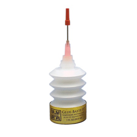 In an EZ-Squeezie bottle! Designed to keep air out and glue fresh! 100% water-soluble glue dries in minutes, holds firmly until moistened or washed, and does not feel stiff when dry. A syringe applicator allows controlled placement of droplets of glue. Contains no dyes, waxes or harmful chemicals, and is pH neutral. Use for temporary basting on appliques, hems, bindings and anywhere you would normally use pins.