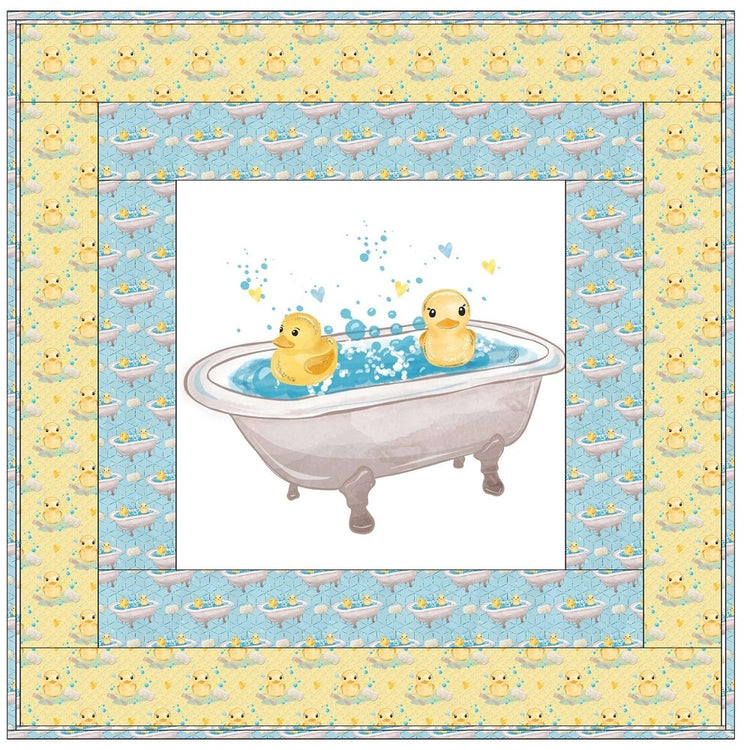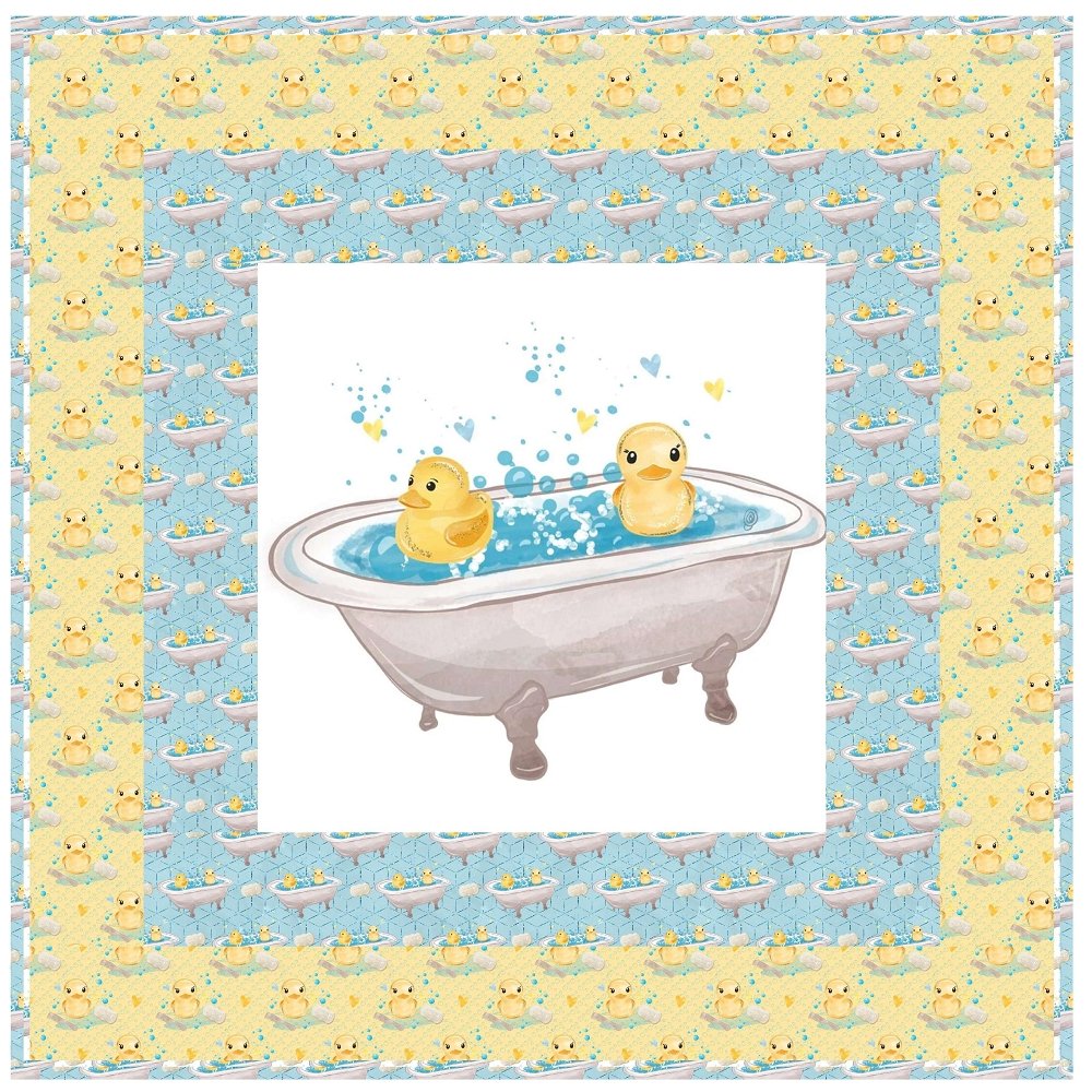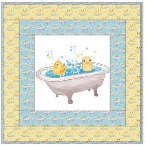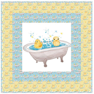 The Rubber Ducks Bathtub Wall Hanging includes everything that you need to make the quilt - the instructions and a total of 3 1/2 yards of fabric and a 23" panel. It has two borders and is finished with a flange binding. Batting is sold separately. The finished size of this quilt is 42" x 42".