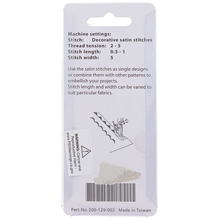 For sewing dense zigzag stitching. The bottom of the foot is beveled for smooth delivery of thread when sewing decorative or sating stitches.