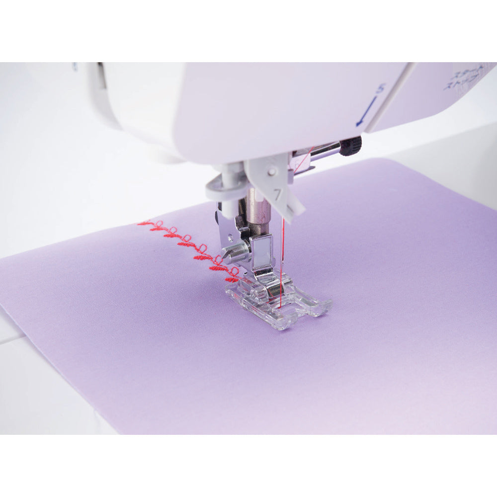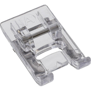 For sewing dense zigzag stitching. The bottom of the foot is beveled for smooth delivery of thread when sewing decorative or sating stitches. Foot is made of clear plastic making it easier to view stitching.