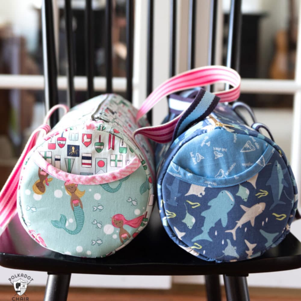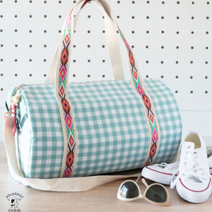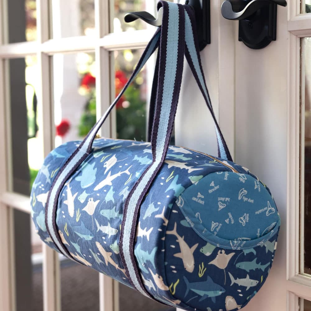 The Saturday Duffle Bag Pattern makes the perfect weekend bag for children. Whether it's a day trip, a friend's sleepover, a weekend at the grandparents, a dance class, a camping trip, or a cheer bag, this duffle is easily the perfect companion. It can be designed in 3 different sizes: small (14" long by 7" deep), medium (16" long by 9" deep), and large (19" long by 11" deep). The pattern features an optional side pocket and a detachable shoulder strap for easy carrying. The Saturday Duffle Bag Pattern is recommended for advanced beginner to intermediate sewists.