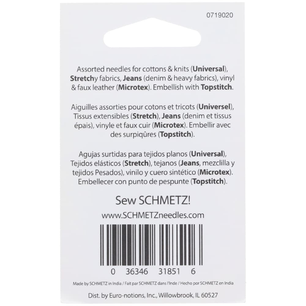 Schmetz Costume Needle Set is designed for costume and cosplay projects. This ten-pack includes universal, stretch, jeans, microtex, and topstitch needles ranging in sizes from 75/11 to 100/16. Use stretch needles when sewing knits and stretch fabrics like spandex, lycra, elastic, and dance/swimwear fabric. Add decorative stitches to your costumes by using the topstitch needle. If you are sewing dense materials such as vinyl, synthetic leather/suede, or microfiber, then the microtex needle is your best option. The denim needle can be used on canvas, denim, and twill, while the universal needle is excellent for woven fabrics, cotton, poly/cotton, linens, nylon, and polyester. These needles can be used in household sewing machine brands where needles with a flat shank are required.