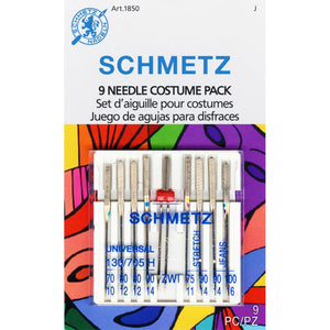 Schmetz Costume Needle Set is designed for costume and cosplay projects. This nine-pack includes universal, stretch, jeans, and twin needles ranging in sizes from 70/10 to 100/16. Use stretch needles when sewing knits and stretch fabrics like spandex, lycra, elastic, and dance/swimwear fabric. The denim needle can be used on canvas, denim, and twill, while the universal needle is excellent for woven fabrics, cotton, poly/cotton, linens, nylon, and polyester. These needles can be used in household sewing machine brands where needles with a flat shank are required.