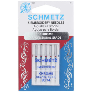 Schmetz Chrome, Professional Grade needles, are designed for sewists, quilters, and embroidery enthusiasts who are sewing faster and more intensely than ever! These chrome-plated needles are beneficial in resisting heat and wear by staying cooler longer, avoiding stitch distortion, and ultimately producing less friction and resistance. Schmetz 130/705 H-E Chrome Embroidery Needles have an enlarged eye and groove, making this a perfect needle for trouble-free embroidery with more fragile embroidery threads. These Needles are great with rayon and other specialty machine embroidery threads, including polyesters. The gorgeous sheen of these threads results in outstanding embroidery work. The special scarf, long smooth groove, and large eye of this needle protect those more fragile threads and guard against excess friction. These needles can be used in household sewing machine brands where needles with a flat shank are required.