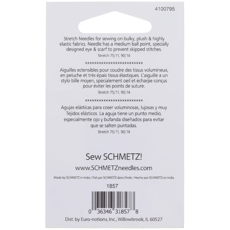 Schmetz 130/705 H-S Stretch Needles are great for sewing bulky, plush, fleece, and highly elastic fabrics. They have a medium ballpoint and a specially designed eye and scarf to help reduce skipped stitches. These features make this needle perfect for knits and elastic or stretch fabrics. These needles can be used in household sewing machine brands where needles with a flat shank are required.