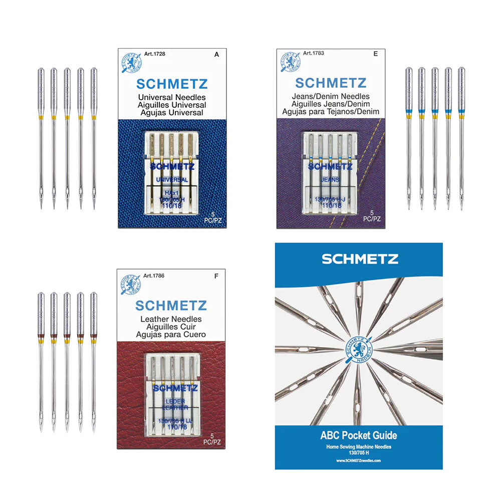 The Schmetz Heavy Duty Needle Bundle is perfect for the quilting and sewing enthusiast who would like to sample different types and sizes of needles. These needles work with most home sewing machine brands that use a 15x1 needle system. Each pack of needles will come in a plastic case that slides shut for safe storage. The needle system, needle type, and needle size are printed on the front of the case. The bundle includes a five-pack of universal 110/18 needles, denim 110/18 needles, leather 110/18 needles, a Schmetz Luggage Tag, and a Schmetz ABC Pocket Guide. Most Schmetz Needles include two color-coded bands just below the shank. The top color indicates the type of needle, and the lower color indicates the size. All of the needles in this bundle will have a yellow lower band to indicate size 110/18.