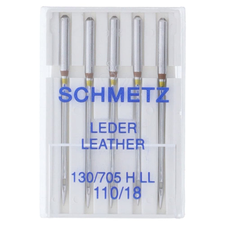 Schmetz 130/705 H LL Leather Needles have a cutting point that makes them excellent for penetrating through leather and similar materials without tearing it. They are not meant for knits, woven fabrics, and some synthetic leathers. The Schmetz Leather Needles have a brown top band.
