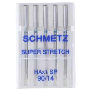 Schmetz Superstretch HAx1SP Serger Needles are special point universal needles that are chrome-plated with a reinforced blade for sergers. The medium ballpoint tip is great for serging stretchy or elastic materials. It features a longer and wider eye than normal, making it suitable for thicker serger/embroidery thread.
