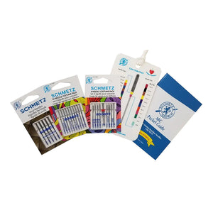 The Schmetz Sample Bundle is perfect for the sewing "newbie" or the sewing enthusiast who would like to sample different types and sizes of needles. These needles work with all home sewing machine brands that use a 15x1 needle system. The bundle includes a set of the 9-pack of costume needles, a 10-pack of costume needles, a 5-pack of vinyl needles, a Schmetz Luggage Tag, and a Schmetz ABC Pocket Guide.