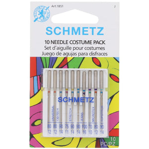 The Schmetz Costume Needle Set is designed for costume and cosplay projects. This ten and nine-pack includes universal, stretch, jeans, microtex, twin, and topstitch needles ranging in sizes from 70/10 to 100/16. Use stretch needles when sewing knits and stretch fabrics like spandex, lycra, elastic, and dance/swimwear fabric. Add decorative stitches to your costumes by using the topstitch needle. If you are sewing dense materials such as vinyl, synthetic leather/suede, or microfiber, then the microtex needle is your best option. The denim needle can be used on canvas, denim, and twill, while the universal needle is excellent for woven fabrics, cotton, poly/cotton, linens, nylon, and polyester. These needles can be used in household sewing machine brands where needles with a flat shank are required.