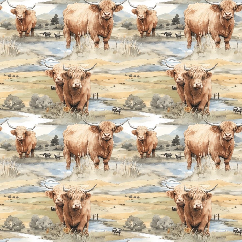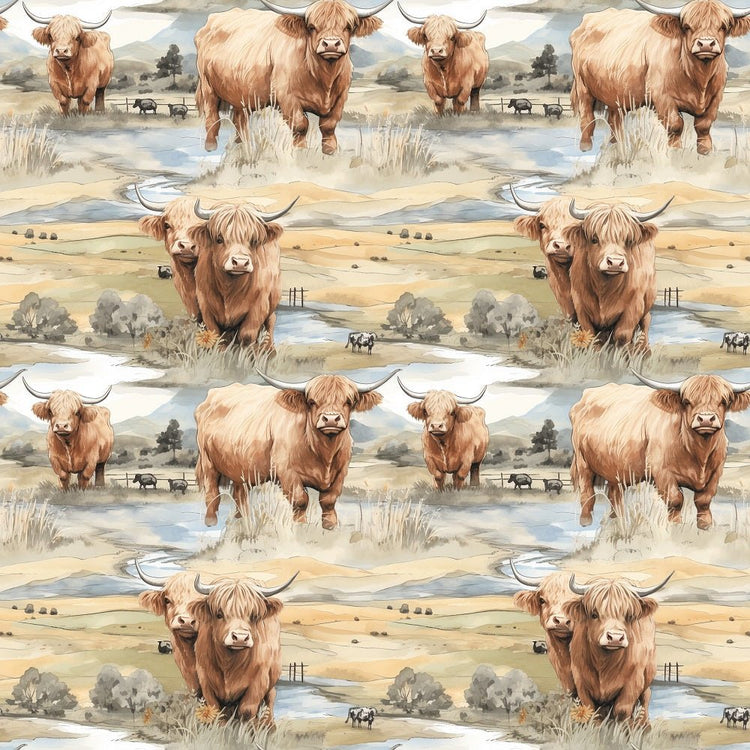 The Scottish Highland Cows 3 Fabric is a part of the Scottish Highland Cows Fabric Collection printed by Sewing Parts Online. Digitally Printed on 100% cotton and measures 43-45" wide. Sewing Parts Online prints are only available through Sewing Parts Online, not sold in stores or anywhere else online.