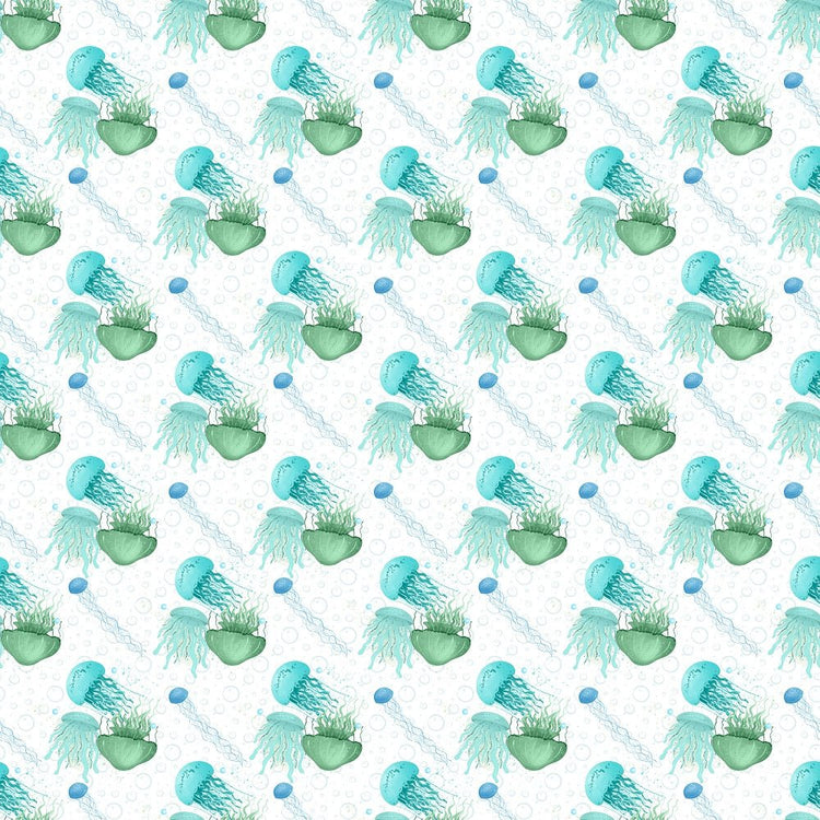 The White Sea Jellyfish Fabric is part of the Sea Jellyfish Fabric Collection printed by Sew Creative Fabrics. Digitally Printed on 100% cotton.