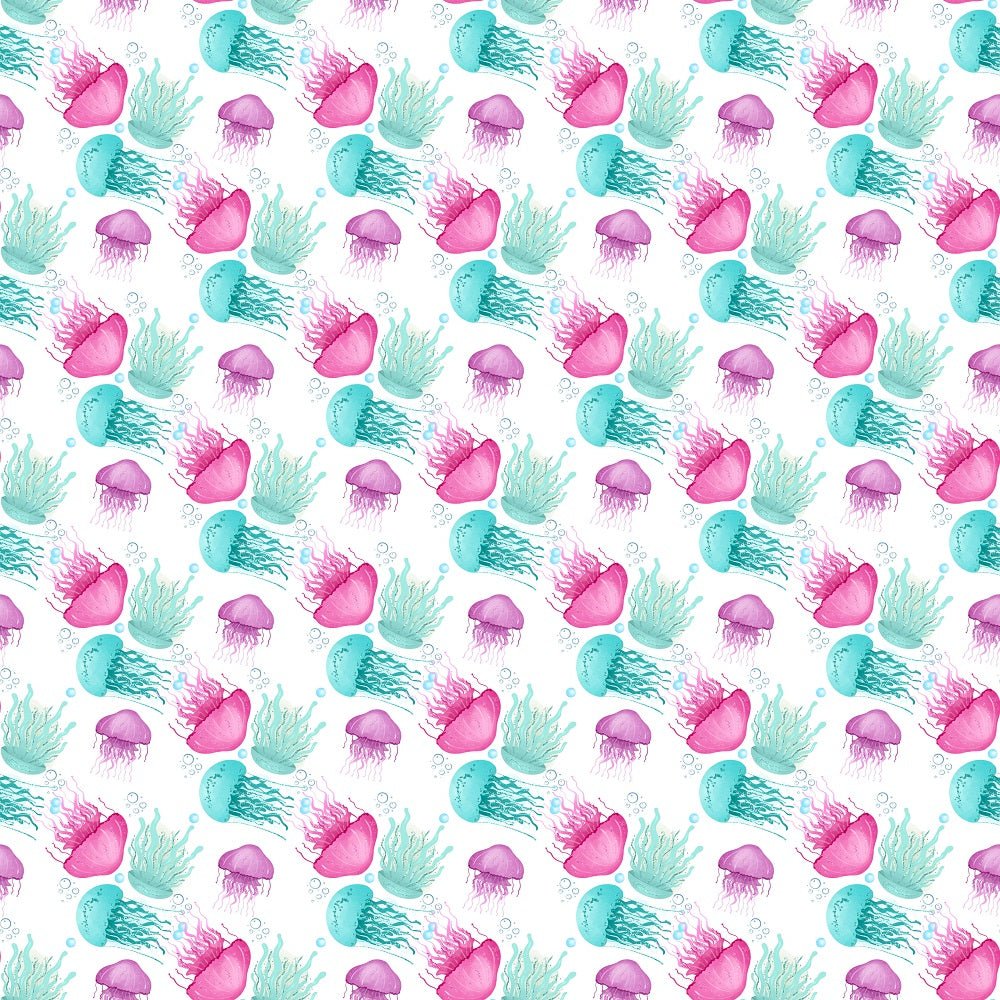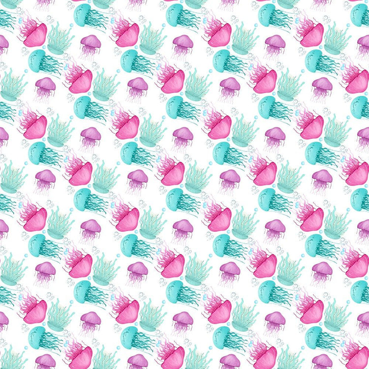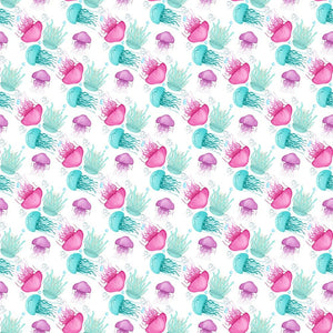 The White Sea Jellyfish Pink and Light Blue Fabric is part of the Sea Jellyfish Fabric Collection printed by Sew Creative Fabrics. Digitally Printed on 100% cotton.