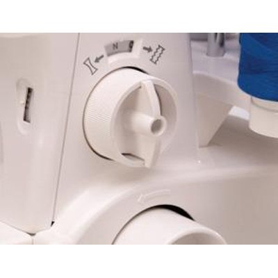 - Stitch functions for a rolled-edge hem, flatlock seaming, and gathering and decorative chaining