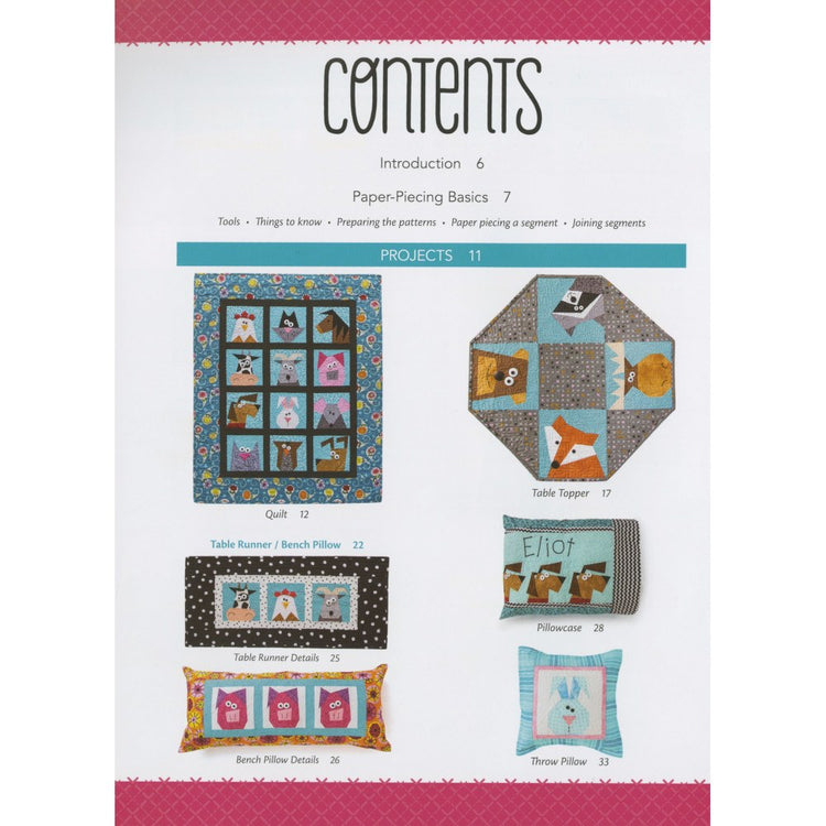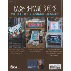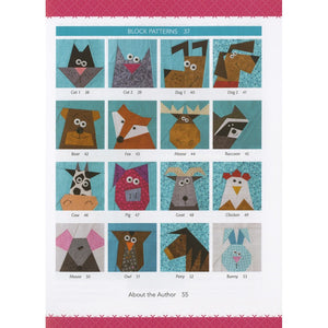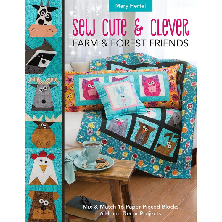 Mary Hertel's Sew Cute & Clever Quilt Book is packed with 16 quilt blocks featuring farm and forest friends. These silly animals are made using paper piecing. The Sew Cute and Clever Quilt Book includes six home decor projects made using any of the sixteen animal blocks. Decorate your home with a quilt, table topper, table runner, bench pillow, pillowcase, and a throw pillow.