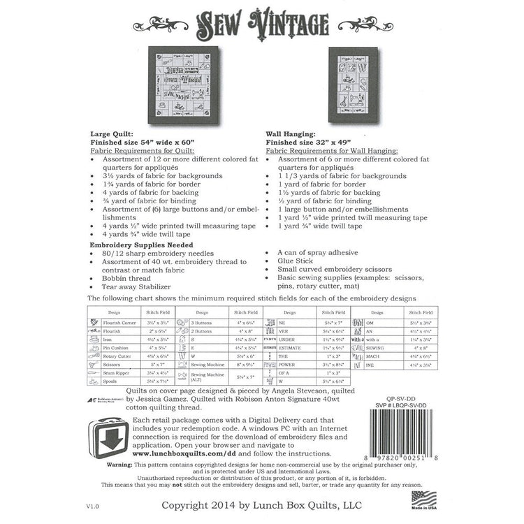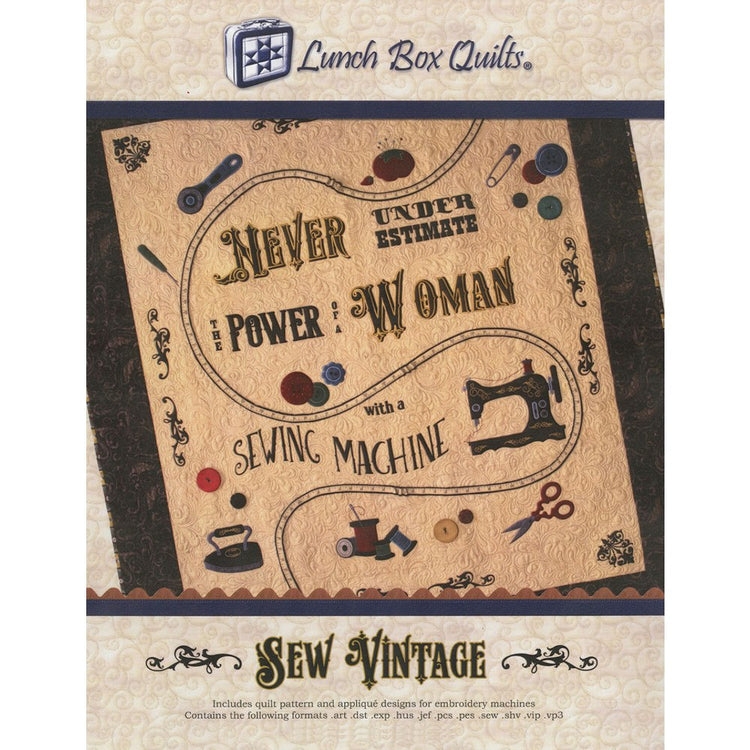 The Sew Vintage Machine Embroidery pack comes with 29 applique and embroidery designs featuring vintage sewing machines! A redemption code is included which allows the user to download these designs from the internet. Also included are two patterns. The featured quote reads, "Never underestimate the power of a woman with a sewing machine." Applique images include sewing notions such as seam rippers, rotary cutters, buttons, scissors, a tomato pincushion, an iron, thread, and more. Make a large quilt measuring 54in by 60in or a wall hanging measuring 32in by 49in. Embroidery formats include .art .dst .exp .hus .jef .pcs .pes .sew .shv .vip .vp3.