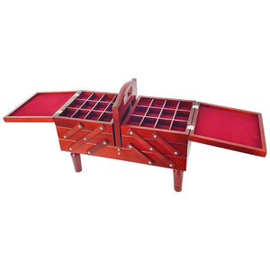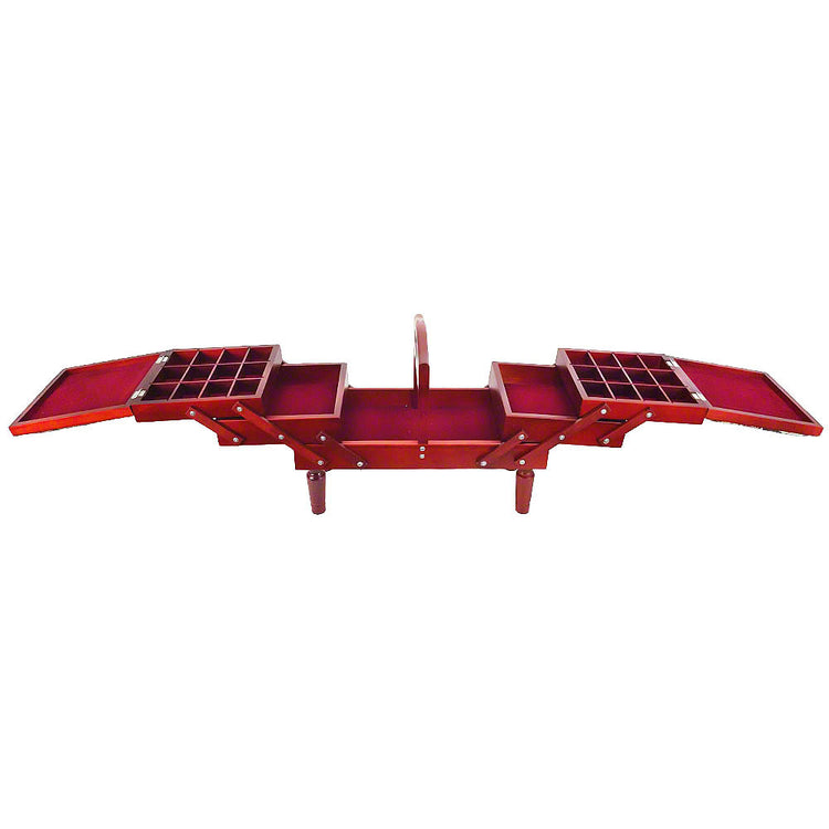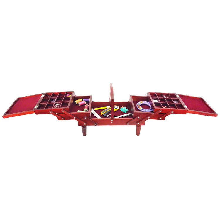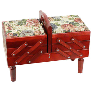 Vintage style sewing caddy with a sturdy handle and removable legs is perfect for crafting on the go. Featuring fold out tiers that provide multiple storage compartments including one large compartment ideal for items such as scissors, quilting rulers, and more. The two upper levels are equipped with adjustable dividers which makes it great for a variety of craft purposes. The padded tapestry toppers can be used as jumbo pincushions! Measures 18-1/2in by 8-3/4in by 14in.