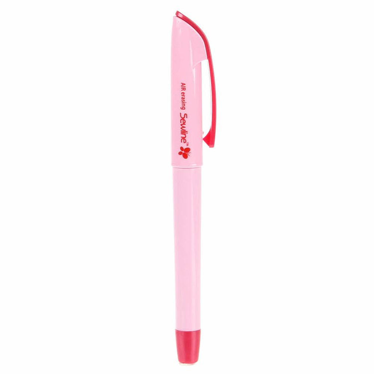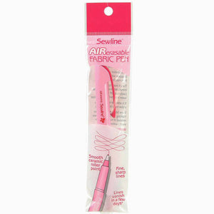 The Sewline Air Erasable Roller Ball Pen contains an advanced technology ink system with 0.8mm ceramic roller ball for fine sharp lines. The Sewline ink will disappear within 2-10 days from most fabrics. The ink marking can be immediately erased with water. Easily touch off using plain water in a Sewline AQUA eraser. It is advisable to remove any visible marks before ironing. Some fabrics contain sizing or other chemicals which may inhibit ink removal. Always test this Sewline pen on a fabric sample before marking up your project.
