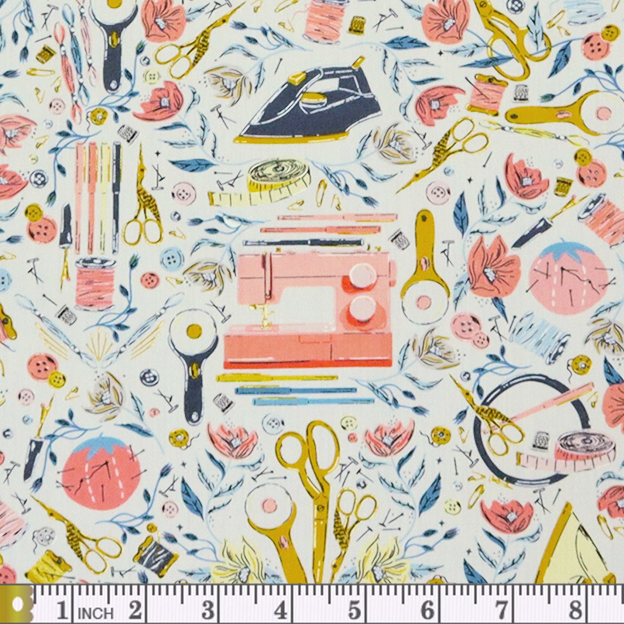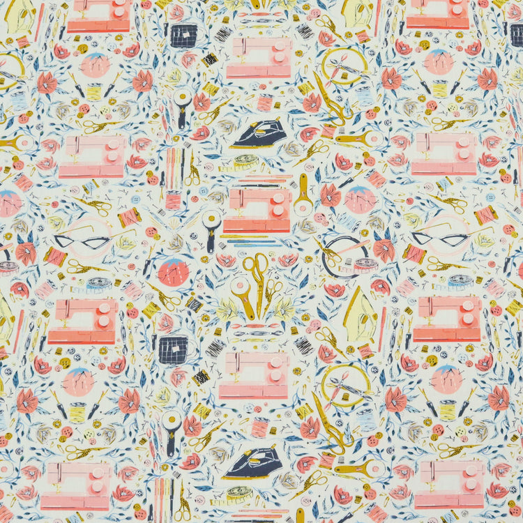 The color palette is fresh and modern, mixing crisp whites, pastel pinks, teal blues, and lustrous gold that pop with energy. Crafted from 100% premium cotton and measuring approximately 44" wide, these fabrics are designed with sewists in mind, featuring whimsical motifs like scissors, pins, thread spools, sewing machines, and stitches.