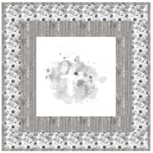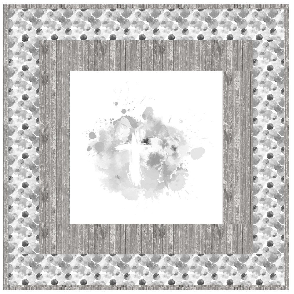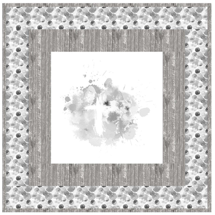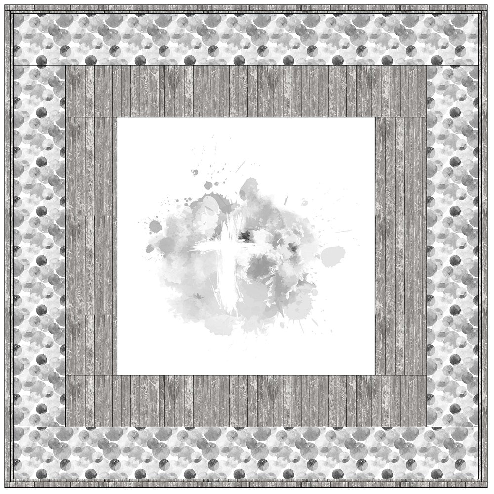 The Shades of Silver Cross Wall Hanging includes everything that you need to make the quilt - the instructions and a total of 3 1/2 yards of fabric and a 23" panel. It has two borders and is finished with a flange binding. Batting is sold separately. The finished size of this quilt is 42" x 42".