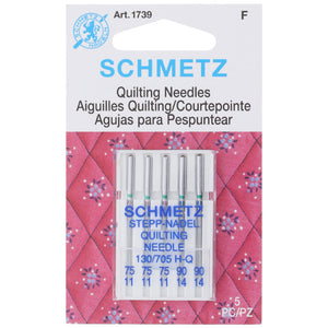 Schmetz 130/705 H-Q Quilting Needles feature a slim acute point and tapered tip, making this needle excellent for piercing tightly woven quilting material without causing damage. These needles are made specifically for piecing and machine quilting. The thin tapered form of these needles allows them to move through many layers smoothly to help eliminate skipped stitches while keeping stitches even.