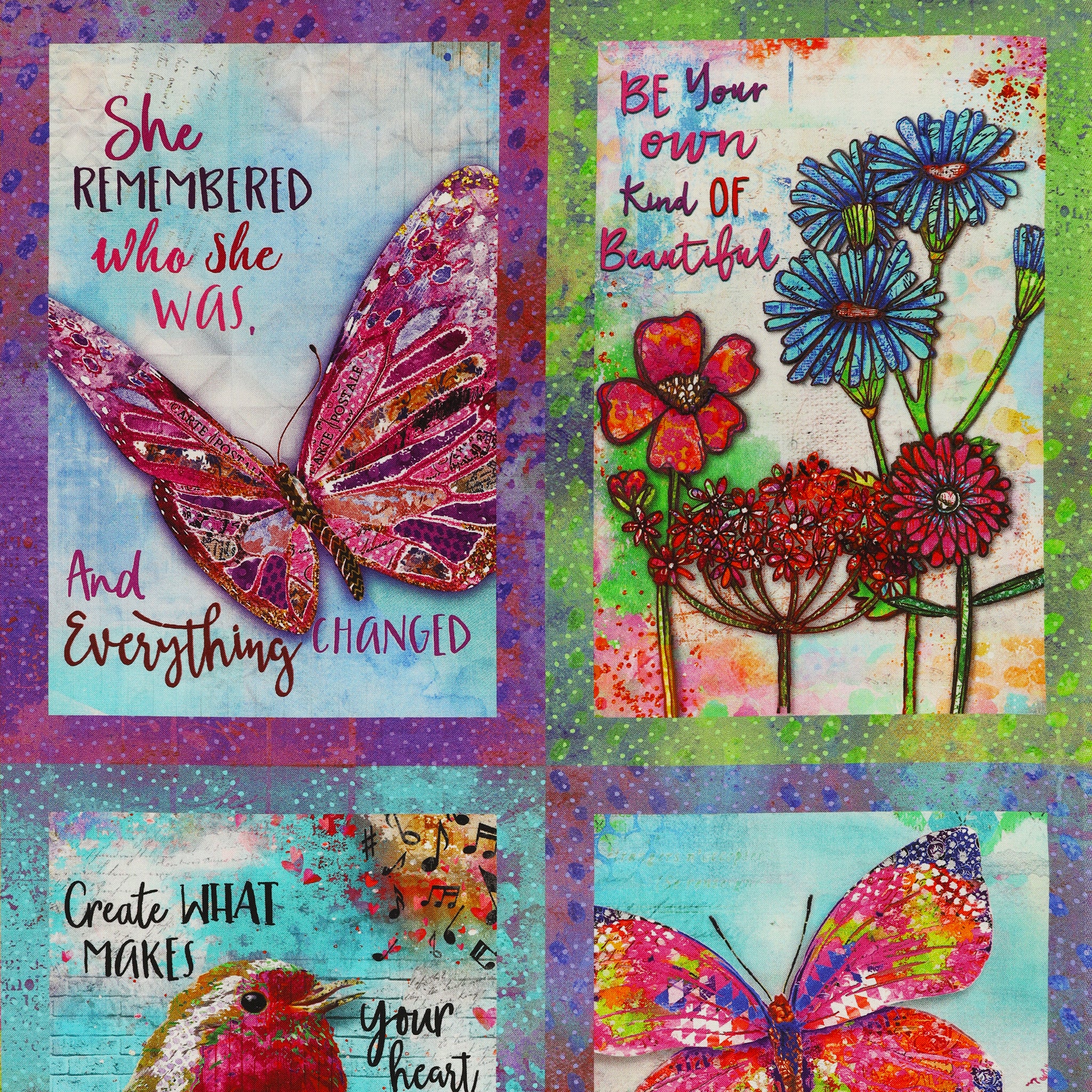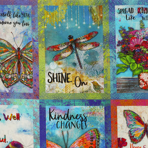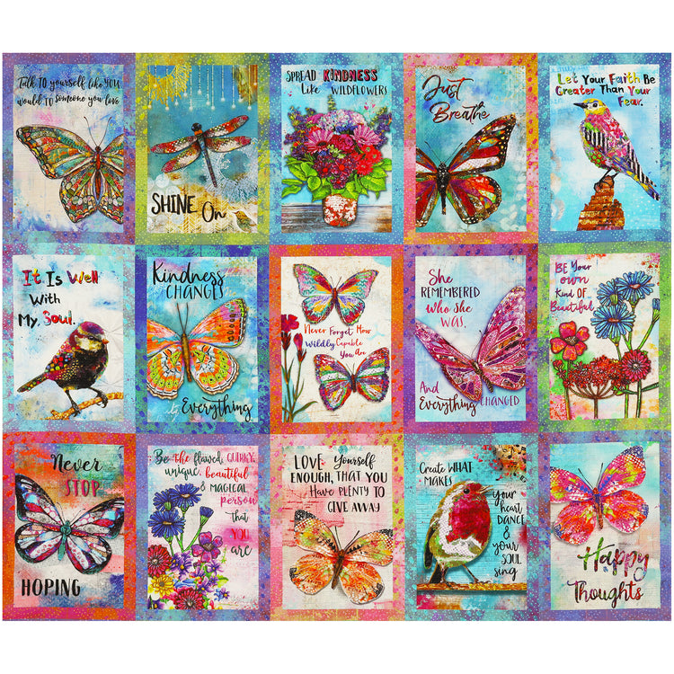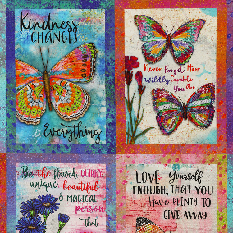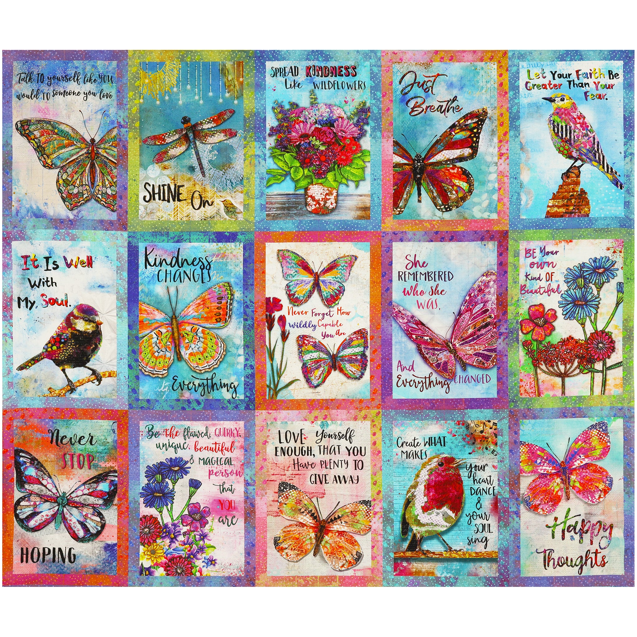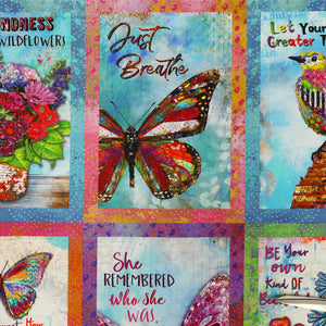 Radiating inspiration, Spread Kindness Panel features fifteen unique blocks, each brimming with colorful butterflies, birds, flowers, and uplifting quotes. Measuring approximately 7" wide by 10-1/2" tall (not including the border around each block), these designs are ideal for fussy cutting into quilt squares, showcasing whole as centerpieces, or incorporating into home décor projects like wall hangings and pillows. The full panel measures 36" x 44" and bursts with richly textured backgrounds and vibrant colors, creating a visually stunning canvas ready to sew into something meaningful. Whether kept intact or separated into individual pieces, it brings beauty, positivity, and heartfelt messages to every project.