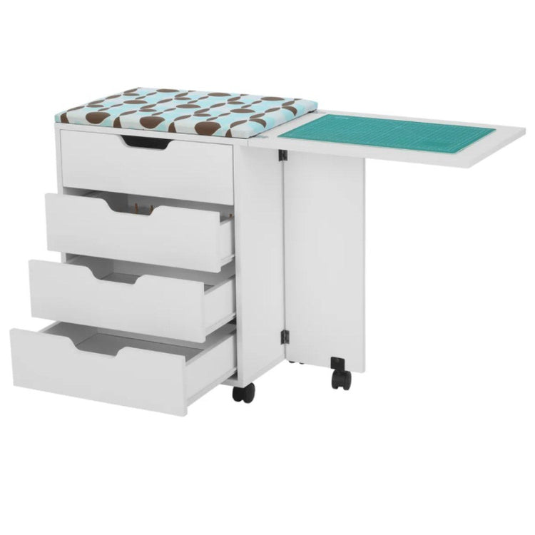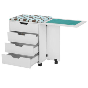 The innovative, multi-functional Shirley Storage Cabinet, designed with you in mind, complements your original sewing workstation perfectly – such as the reputable Laverne Sewing Cabinet. It features a built-in ironing station, a cutting mat, and four large drawers devoted to storing all your notions and accessories making it an excellent addition. Is your sewing room tight on space but needs some extra storage? The Shirley Storage Cabinet closes down into a compact size, fitting into any small room when not in use—also, designed with heavy-duty locking casters, makes mobility a problem of the past.