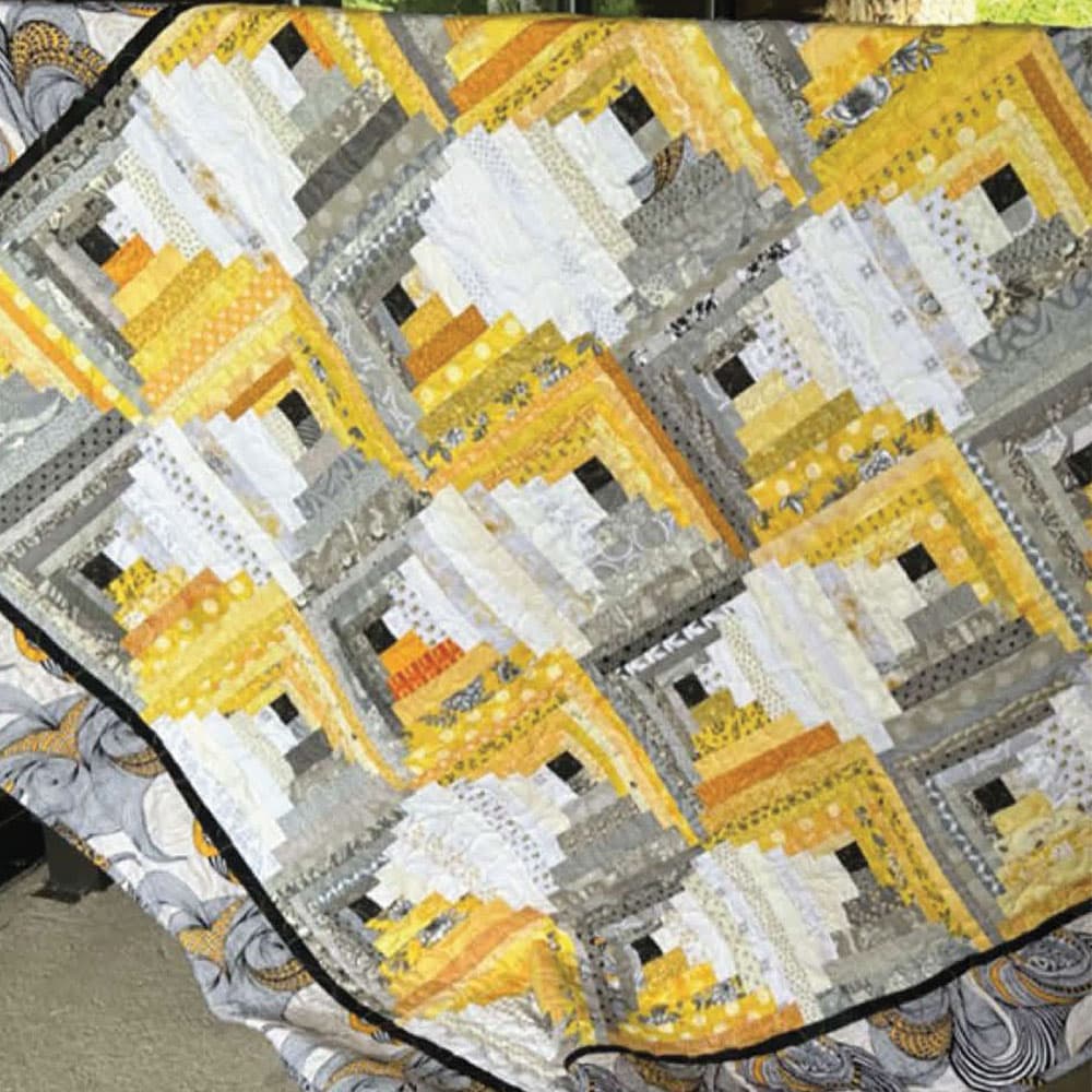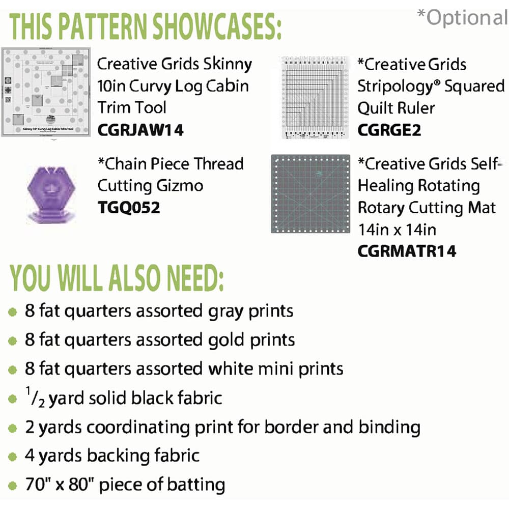 Silver and Gold by Jean Ann Wright is as simple as it sounds, and the curves in this pattern flow across the quilt. When coordinating the fabrics in adjoining blocks, a star is born! In this pattern, the blocks alternate to wide and narrow logs to add more drama to the final product! You will need the Creative Grids Skinny 10 in. Curvy Log Cabin Trim tool to complete this pattern. Some other recommended devices are Creative Grids Stripology Squared Quilt Ruler and Creative Grids Self-Healing Rotating Rotary Cutting Mat 14 x 14in. This pattern creates a quilt that is 62" x 72", so grab your coordinating fat quarters, and you are ready to go!