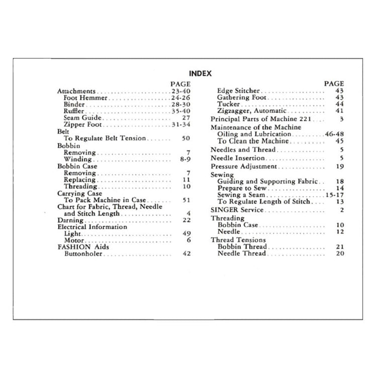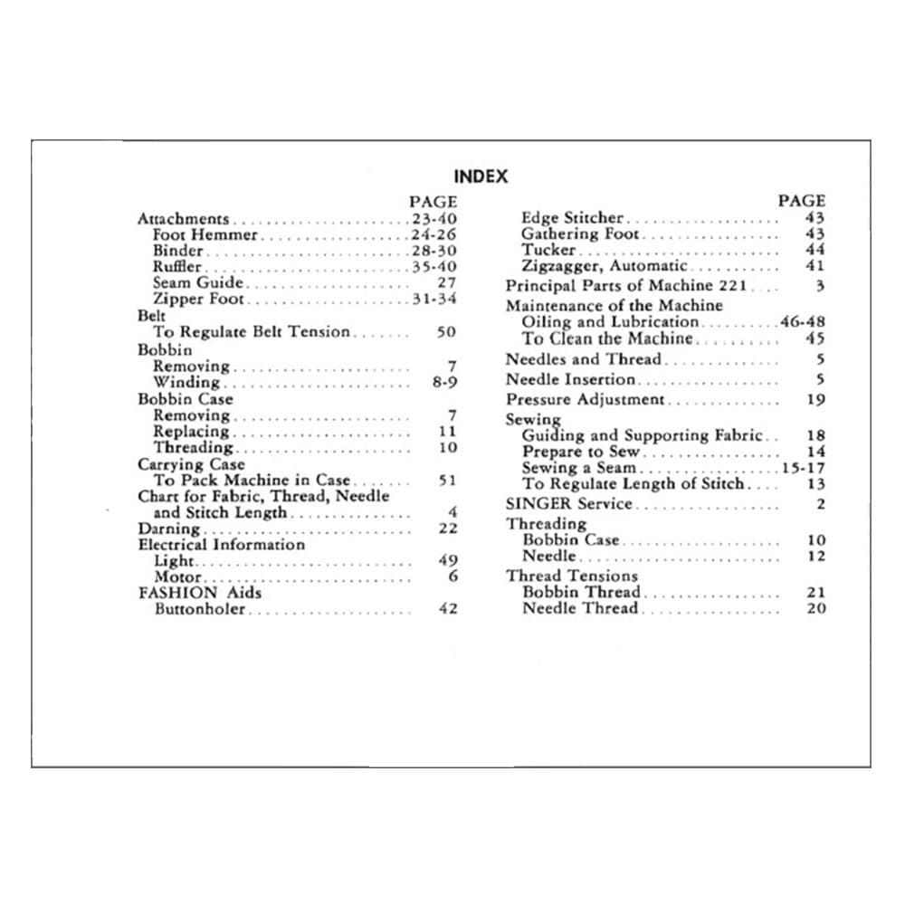 Singer 221 Sewing Machine Instruction Manual (Model 221) - 52 Pages. Lost your sewing machine's manual? We've got you covered! This instruction manual is the ultimate guide to unlock the full potential of your Singer 221. No more confusion or frustration—just clear, concise instructions right at your fingertips. What's inside? Everything you need to know from setting up to mastering your sewing machine and all its features. The physical copy of the instruction manual is a soft-cover printed photocopy.