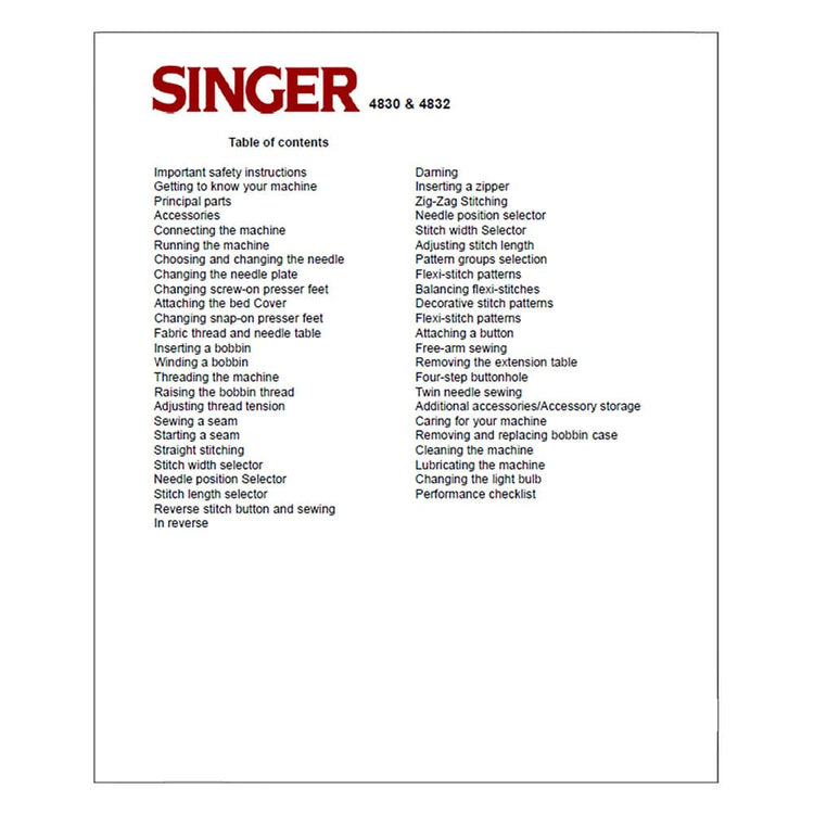 Singer 4832 Sewing Machine Instruction Manual (Model 4832) - 40 Pages. Lost your sewing machine's manual? We've got you covered! This instruction manual is the ultimate guide to unlock the full potential of your Singer 4832. No more confusion or frustration—just clear, concise instructions right at your fingertips. What's inside? Everything you need to know from setting up to mastering your sewing machine and all its features. The physical copy of the instruction manual is a soft-cover printed photocopy.