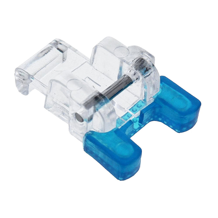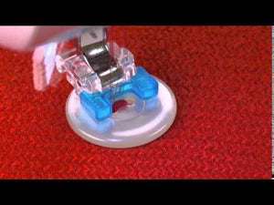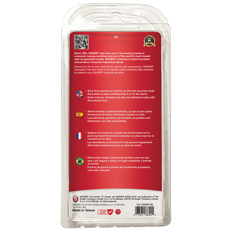 Save time sewing on buttons as the foot securely holds the button in place while sewing it on to the fabric. Hook and eye closures can also be attached easily with this presser foot.