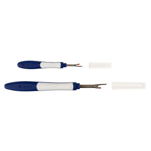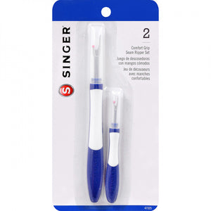 The Singer Comfort Grip Seam Ripper Set can be used to pick threads, open stitched buttonholes, and remove buttons and snaps. Its blue and white comfort grip handles are easy to hold and maneuver. A necessity for any tailor or seamstress, these seam rippers come equipped with a cap for user safety and tool protection.