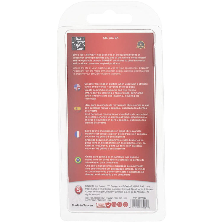 This darning foot is used for free hand embroidery and quilting (stippling).