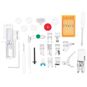 General Purpose Foot, Zipper Foot, Buttonhole Foot, Satin Foot, Blindhem Foot, Open Toe Foot, Cording Foot, Darning/Embroidery Foot, Even Feed/Walking Foot, Overcasting Foot, Button Sewing Foot, Narrow Hem Foot, Quarter Inch Foot, Quilting Bar, Pack of Needles, Bobbins (Class 15 Transparent), Spool Caps, Auxiliary Spool Pin, Spool Pin Felt, Screwdriver, Seam Ripper/Lint Brush, Hard Dust Cover, Foot Control/Power Cord, Extension Table.