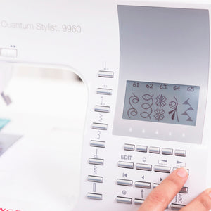 The Singer Quantum Stylist 9960 features an easy-to-read LCD screen that displays the selected stitch pattern number, recommended foot, and adjustable stitch width and length. The high-resolution LCD screen lets you easily view your settings, such as selecting a pattern, combining stitches, winding your bobbin, adjusting thread tension, and more!