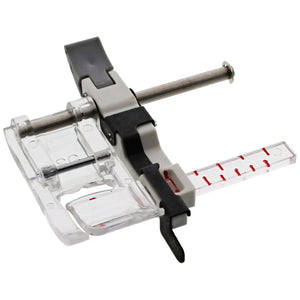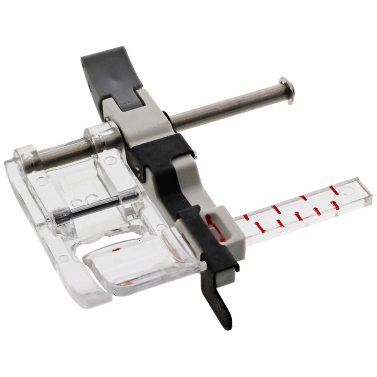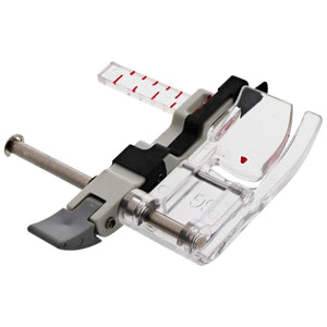 The Sliding Guide Foot allows you to adjust the flange to sit up to a full inch away from the edge. With this foot, you can create perfectly straight hems within seconds every time. The guide on this foot can be moved freely and easily by just lifting the lever in the back without having to move the screw. The clear markings on the foot ensure you know exactly where you want your foot to go.