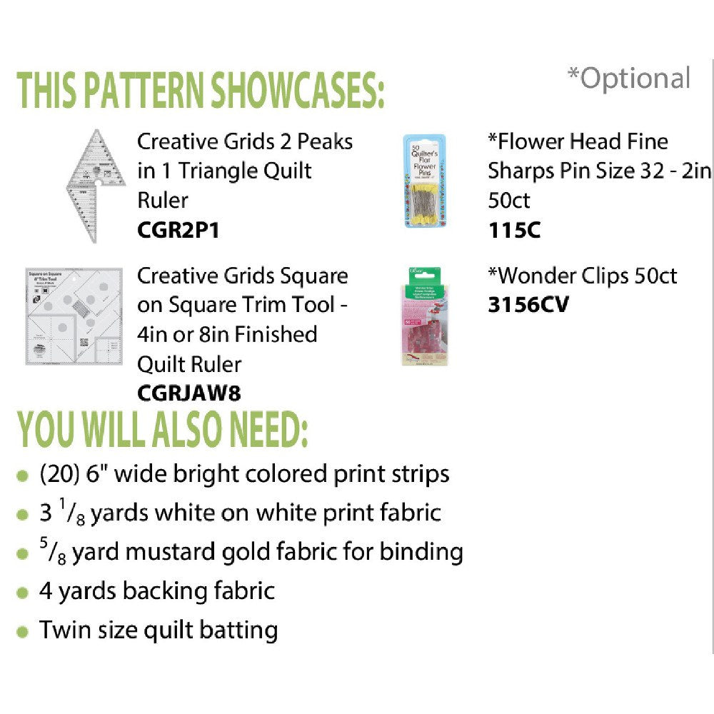 The Snails Trail Quilt, designed by Jean Ann Wright, finishes to 62 inches square. This large quilt is a 6+ hour project. The pattern includes full instructions and a list of required fabrics and tools. The Snails Trail Quilt Pattern requires the use of the Creative Grids 2 Peaks in 1 Triangle Quilt Ruler and Square on Square Trim Tool. Pattern from Cut Loose Press.