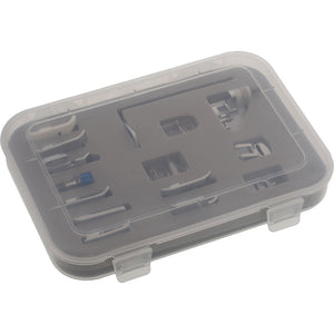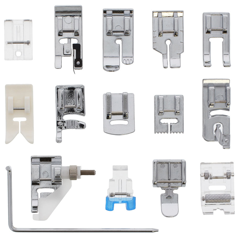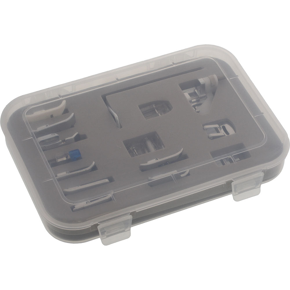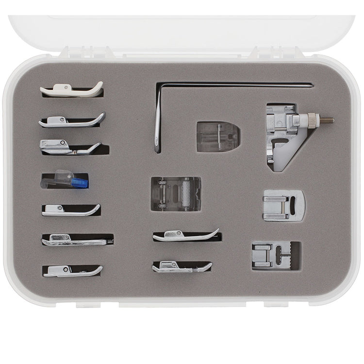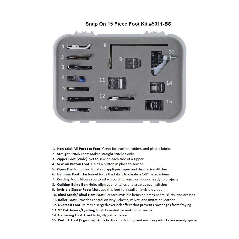 This is a set of 14 essential snap-on presser feet, a quilting guide bar and a hard plastic stackable carrying case for the sewist of any skill level. Included feet are Non-Stick Foot, Open Toe Foot, Quilting/Straight Foot, Sew-on Button Foot, Zipper Foot, Invisible Zipper Foot, Hemmer Foot, Blind Stitch Foot, Cording Foot, Overcast Foot, 1/4" Patchwork Foot, Gathering Foot, Pintuck Foot (5 Groove) and a Roller Foot. This set fits most low shank machines, but depending on the functions of your machine, not every snap on foot may be able to be utilized.