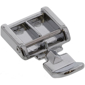 This foot can be set to sew on each side of the zipper. The edge of the foot guides the zipper to ensure straight placement.